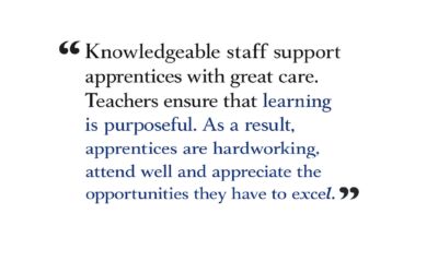 This is a fantastic opportunity for you to gain and develop all the relevant job-specific skills from your employer, and be supported through a nationally recognised qualification by specialist, highly qualified and experienced staff. You will also have the opportunity to improve your English and Maths, get specialist careers advice and be supported by our dedicated pastoral team.